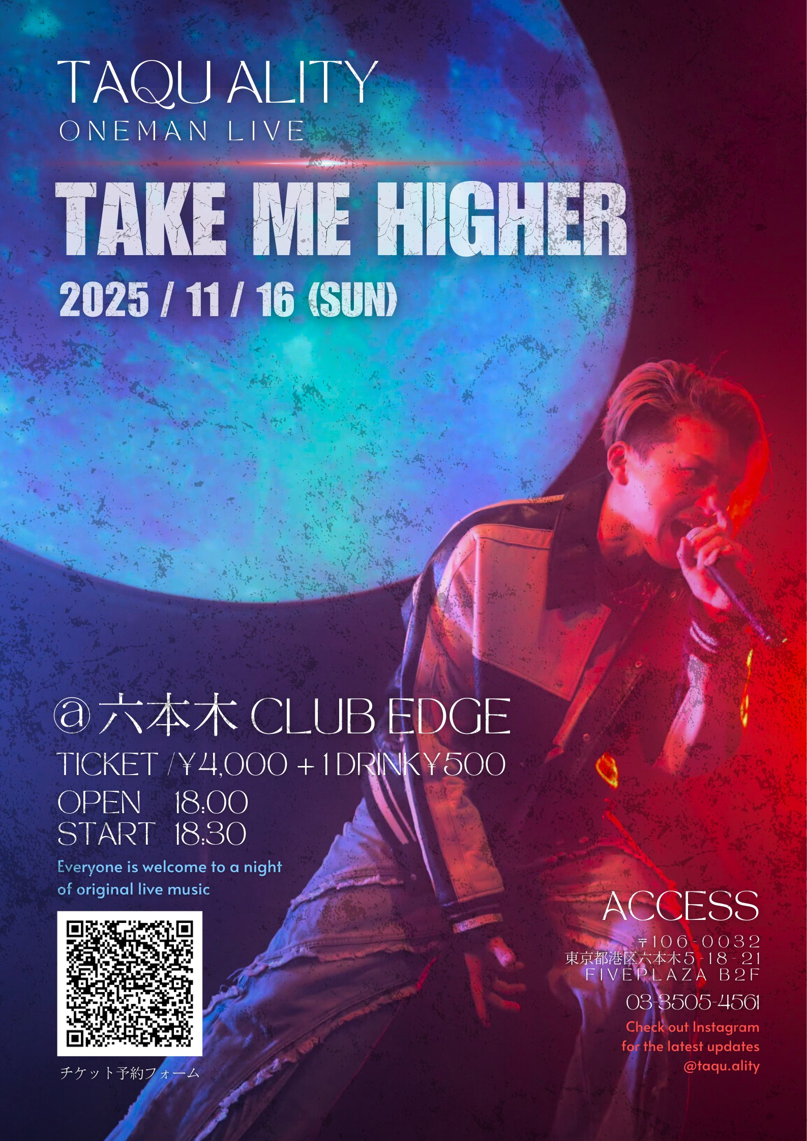 TAQU ALITY ONE MAN LIVE 「TAKE ME HIGHER」 ●OPEN 18:00 ●Start 18:30 ●一般TICKET ¥4,000+1Drink(¥500) 【ACT…