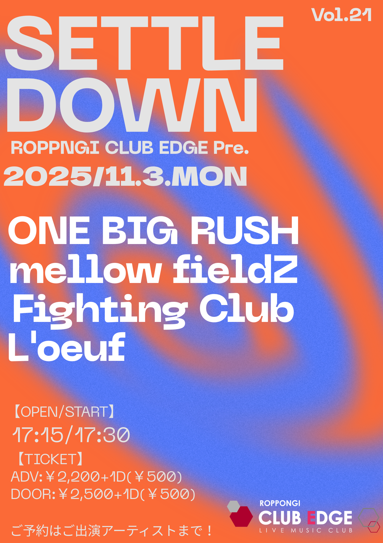 CLUB EDGE pre.『SETTLE DOWN vol.21』 ●Open 17:15 /Start 17:30 ●ADV ¥2,200 + 1 Drink (¥500) ●DOOR ¥2,50…
