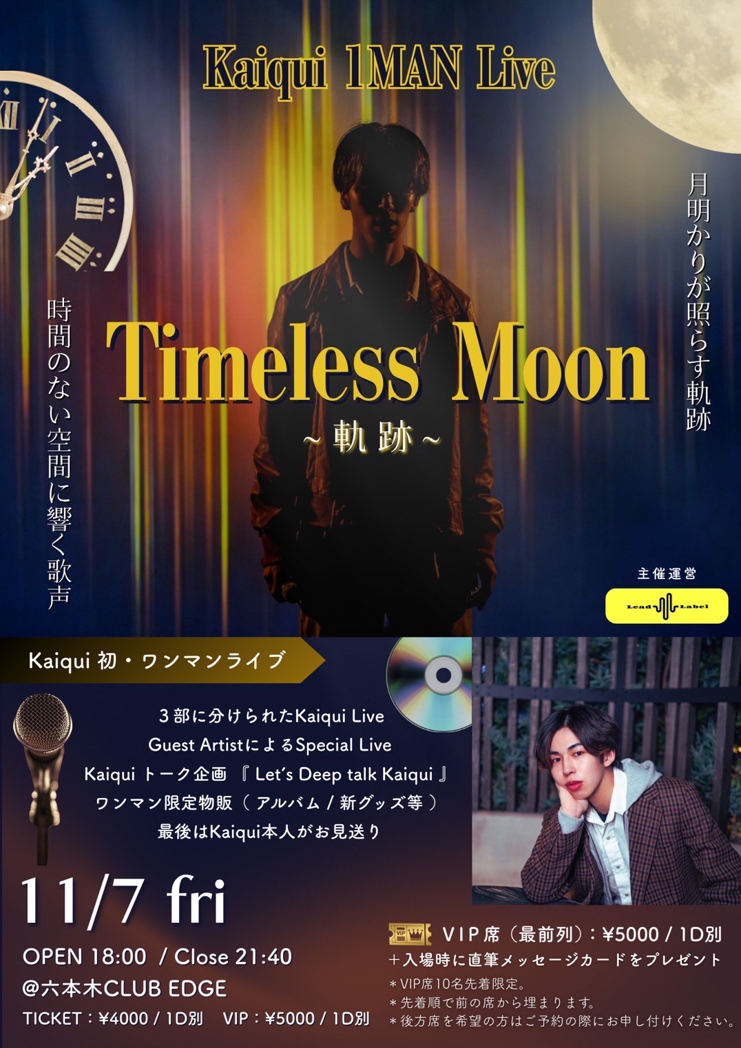 Kaiqui 1MAN Live" Timeless Moon " ~軌跡~ 「月明かりが照らす軌跡 時間のない空間に響く歌声」 ●OPEN 18:00 ●一般TICKET ¥4,000+1Drink…