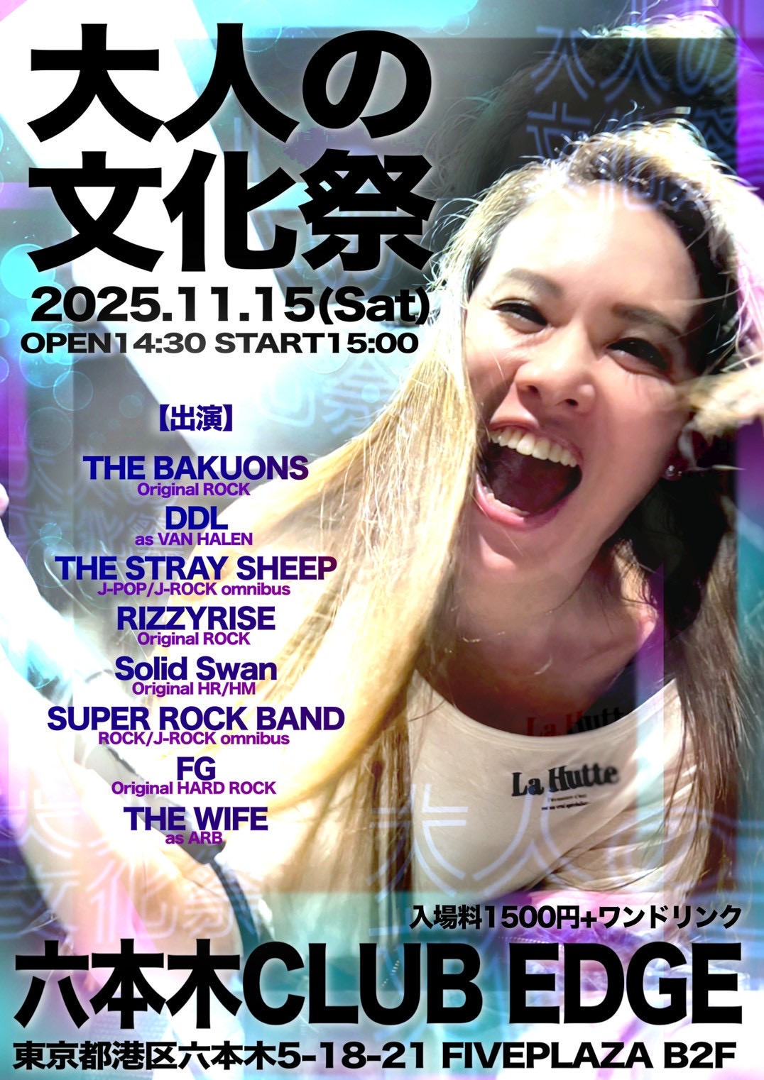 大人の文化祭 ●OPEN 14:30 ●START 15:00 ●ADV ¥1,500 + 1 Drink (¥500) ●DOOR ¥1,500 + 1 Drink (¥500) 【ACT】 ①バク…